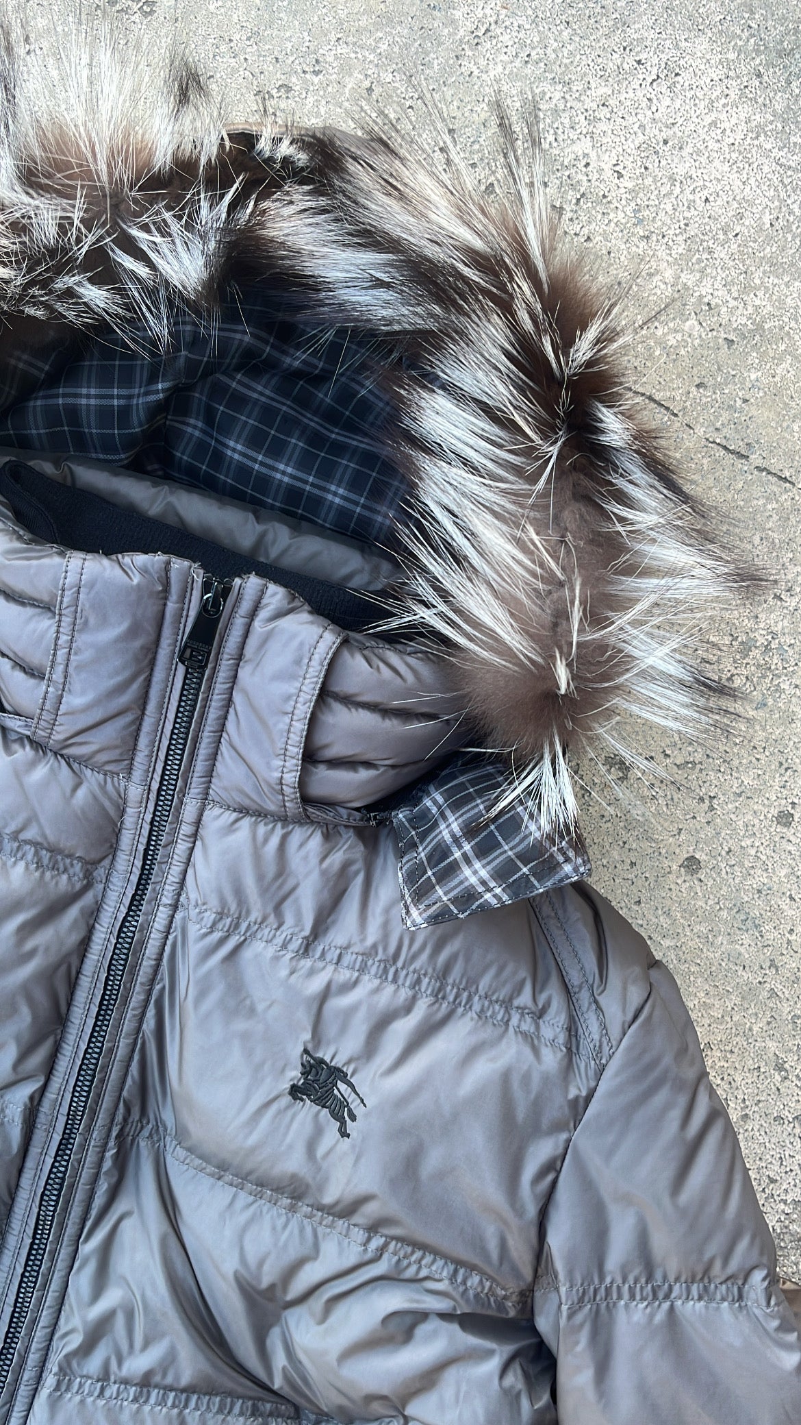 Burberry Black Label Glossy Grey Jacket - L - Real Silver Fox Fur