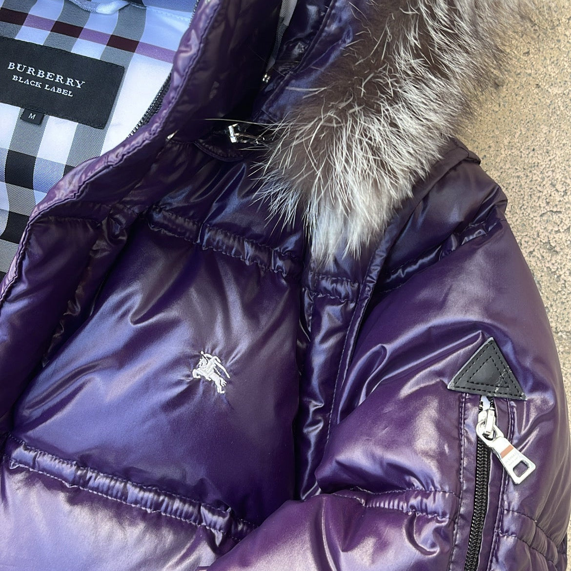 Burberry Black Label Glossy Purple Jacket - M - Real Silver Fox Fur